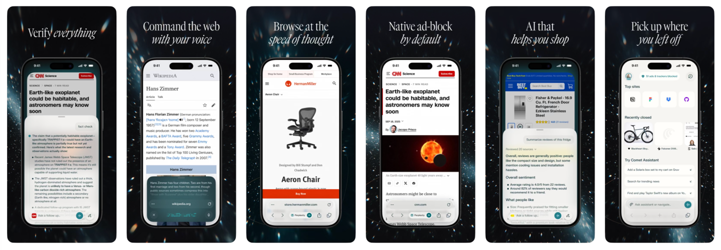 笔据 App Store 的页面预览,iPhone 版 Comet 将中枢功能聚焦于“AI 搜索”与“即时对话”。该浏览器被定位为用户的“个东谈主助理”与“念念考合营伙伴”,具备自动化解决智商。