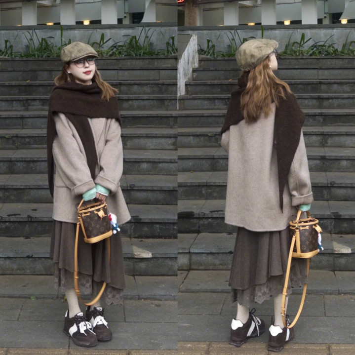 虽然,念念要浅薄利落,中长款大衣必弗成少,卡其灰色大衣配咖啡色不法规半身裙,深咖色领巾点缀造型的讲究感,充满高等的氛围感穿搭,谁说小个子一定要突显腰线,一定要显高呢?这样的穿搭谁不心动?
