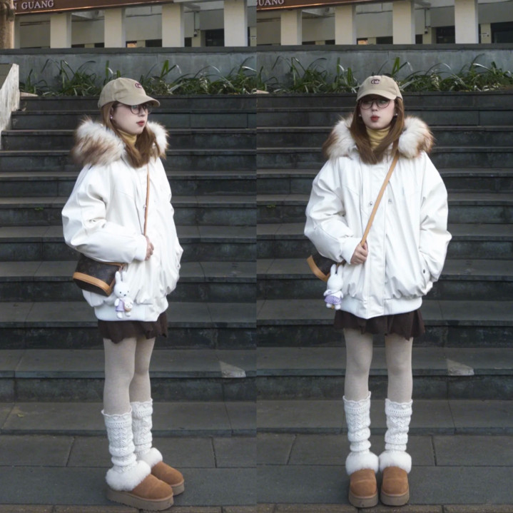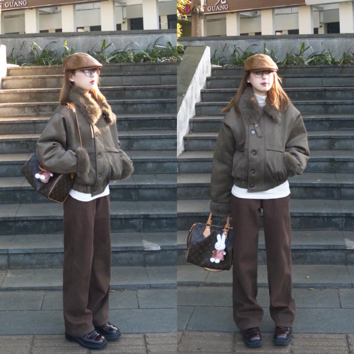 军绿色的皮草外衣,一样是短款野心,叠穿白色长内搭,下半身深咖色直筒裤,卓绝从简利落的穿搭,好穿且不易出错,相宜模仿。
