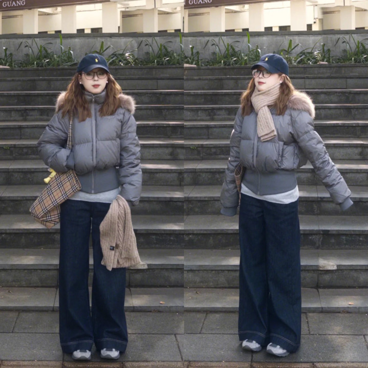 再来望望短款羽绒服+阔腿裤的搭配,遴荐超短款收下摆野心的灰色羽绒服,搭配深蓝色窄版牛仔阔腿裤,上短下长,叠穿长款的浅灰色打底衫,丰富档次感,合座造型看起来卓绝清闲。