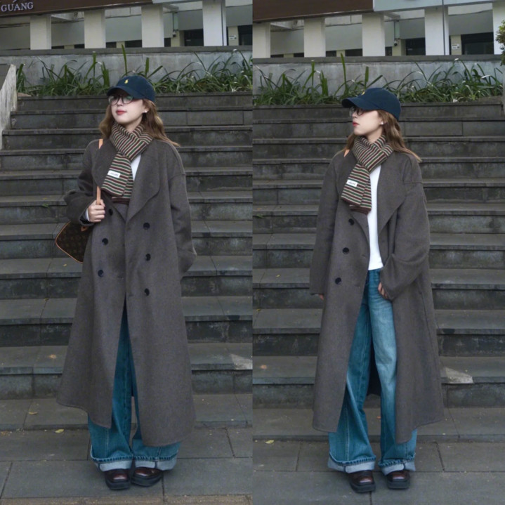 关联词博主菜菜似乎专爱反其谈而行,比如这套灰色长款大衣,长度都快到脚踝了,但合座穿搭恶果看起来却卓绝的浅薄利索 ,领先大衣的版型等于比拟浅薄的表情,内搭纯白色打底,窄版牛仔阔腿裤,卷起裤腿增多了个性,这样看来似乎小个子也能很好的独霸长款大衣。