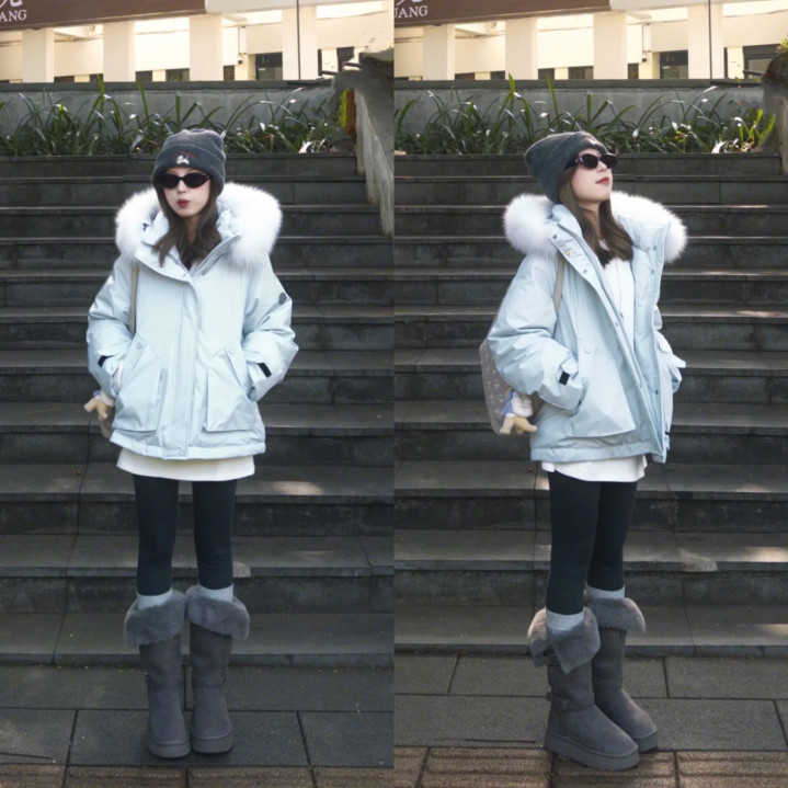 小个子的冬季穿搭也要耀眼颜色搭配,比如上浅下深的搭配次第,浅蓝色派克羽绒服叠穿白色打底衫,下半身玄色打底裤+灰色长筒雪地靴,卓绝相宜冬季御寒的一套显瘦穿搭。