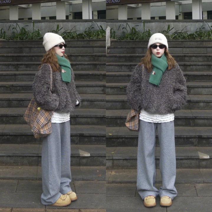 深灰色羊羔绒外衣叠穿白色打底,丰富档次感,下半身搭配灰色直筒卫裤,失业舒坦,用一条绿色的领巾+白色真挚帽点缀造型,超等有氛围感的冬季穿搭。