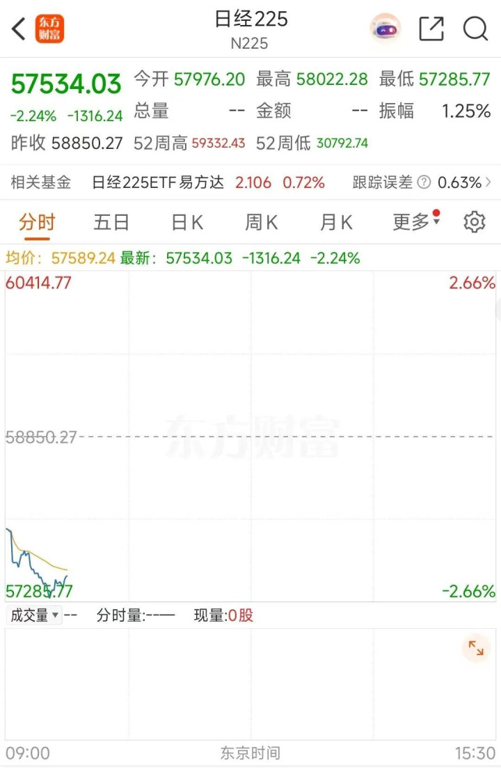 3月2日早盘,日经225指数开盘下落1316点,跌幅2.24%,报57534点。