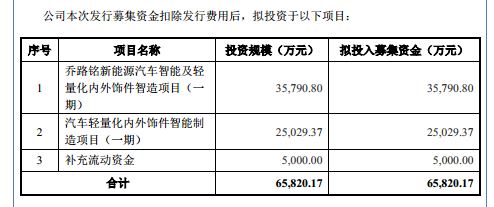 乔路铭这次IPO欲召募65820.17万元,划分用于乔路铭新动力汽车智能及轻量化表里饰件智造技俩(一期)、汽车轻量化表里饰件智能制造技俩(一期)、补充流动资金,具体情况如下: