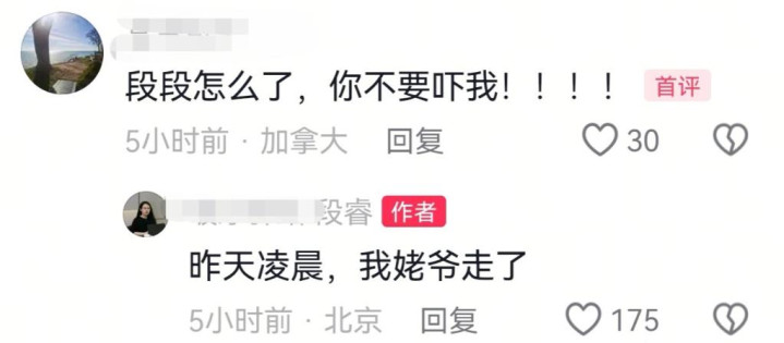 在后续和网友的对话里,她说出了确实的原因——昨天凌晨,姥爷走了。她没在身边。