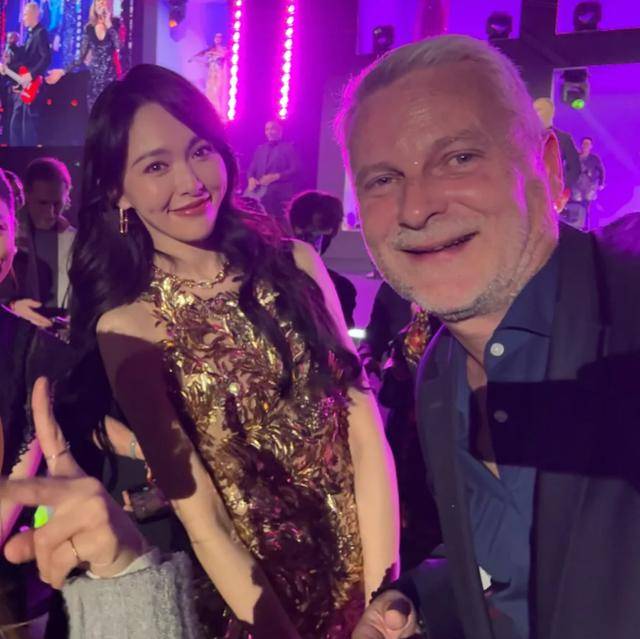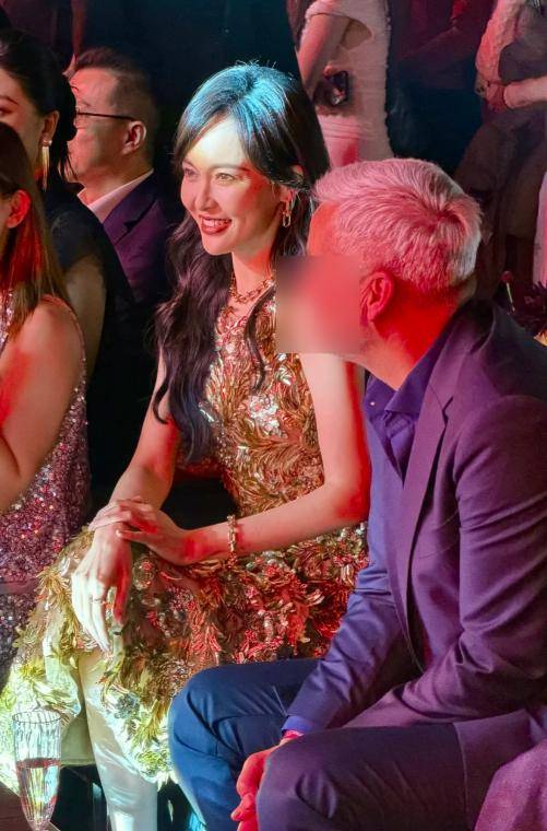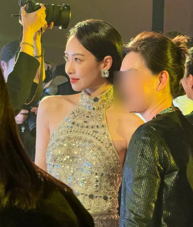 她穿的是一条Zuhair Murad 2026早春度假系列的金色挂脖裙,这条裙子和鄙俚的金裙不相似,上头缀满了手工亮片和水晶刺绣,灯光一打,全身就像裹了一层流动的星河,每走一步都在发光。