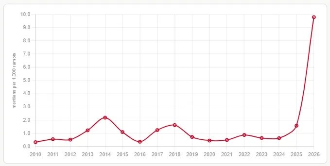 这张折线图展示了在2010年至2026年间开云sports,kaiyun sports环节词“摆烂”在每1000条坏话中的说起次数的变化趋势。