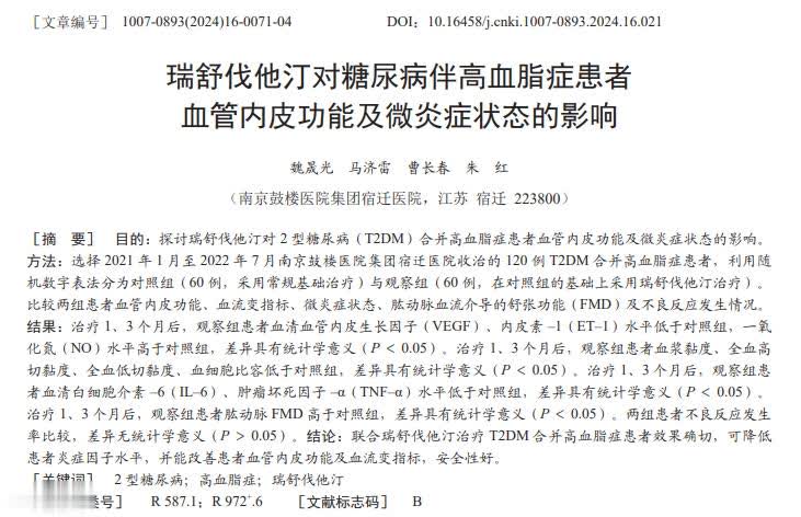 参考贵寓:[1]魏晟光.瑞舒伐他汀对糖尿病伴高血脂症患者血管内皮功能及微炎症气象的影响,深圳中西医集会杂志,2024-08-30