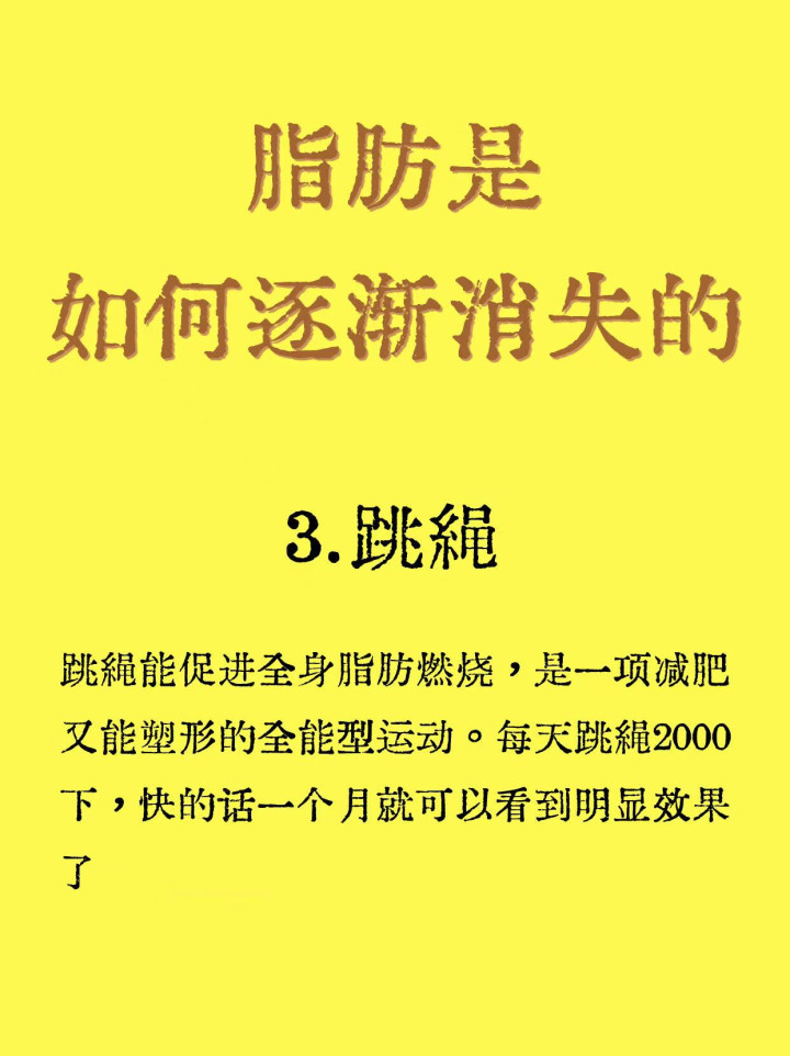 不必去健身房,不必花大价格办卡,一根跳绳,每天2000下,即是最高效的燃脂运动,让脂肪快速“挥发”。