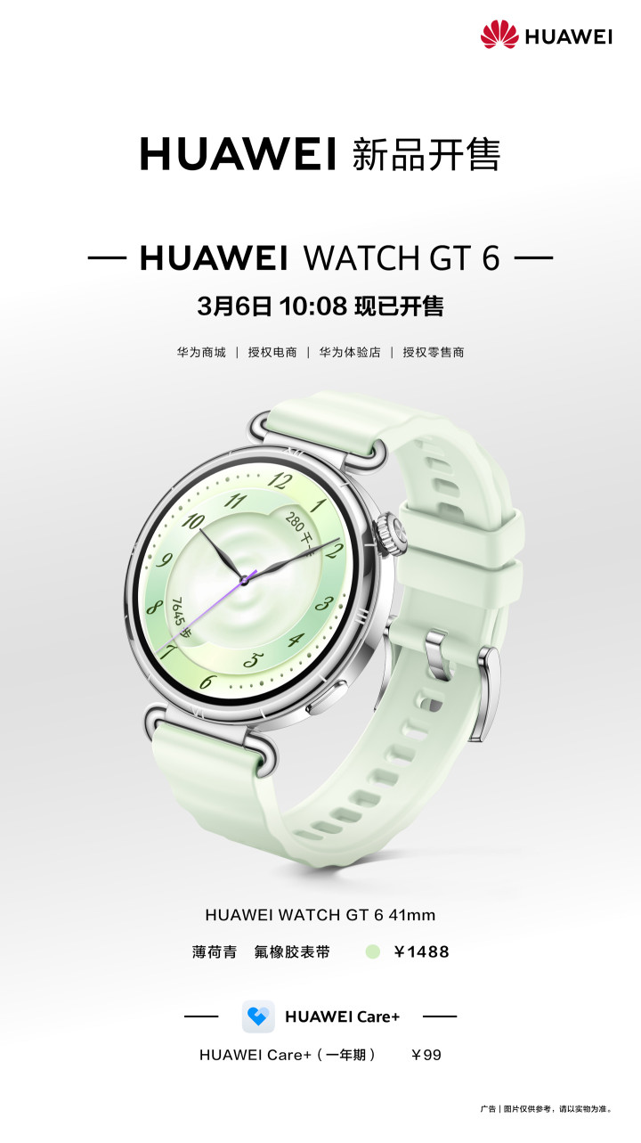 IT之家3月6日音讯,华为本日通告推出HUAWEIWATCHGT6全新薄荷青配色,并将至本日10:08负责开售,配氟橡胶表带,首发价1488元。