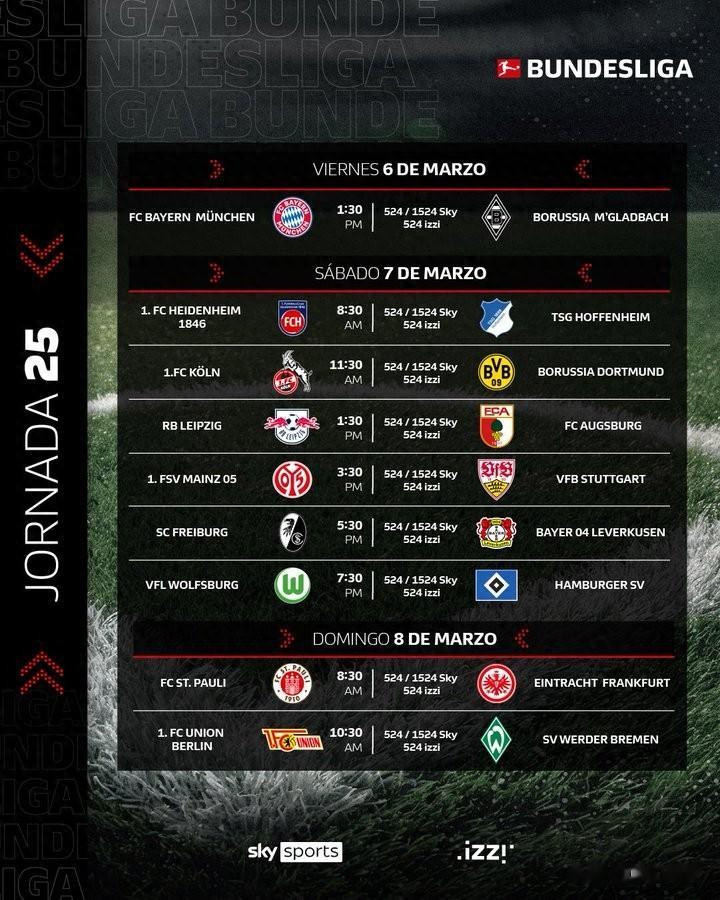 北京时间3月7日03:30至3月9日00:30,25/26赛季德甲联赛第25轮的较量将在本周末伸开一起9场比赛的较量。而在本轮,拜仁将当先出战、主场对阵苦主门兴格拉德巴赫,勒沃库森和多特则均为客场作战、敌手分手为弗赖堡和科隆。